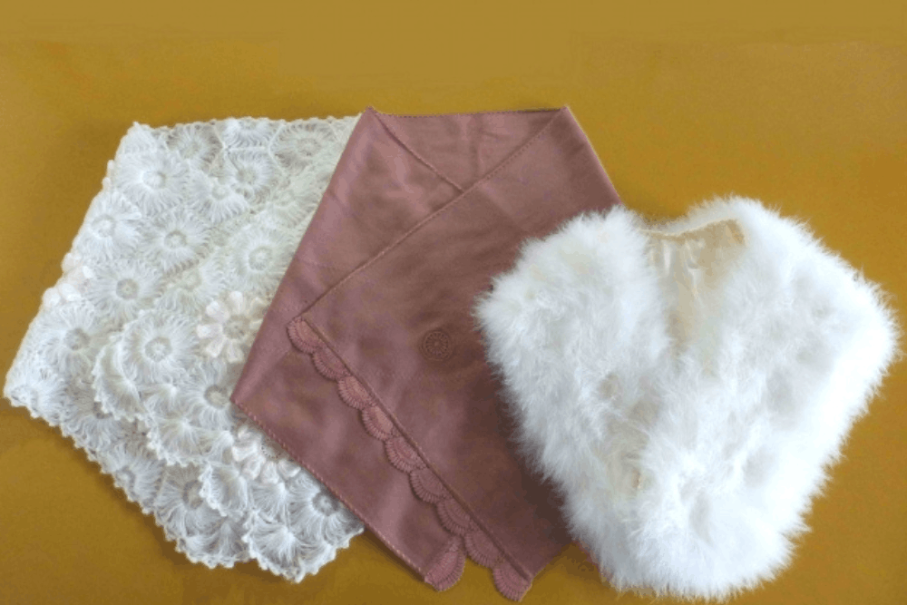 結婚式や式典などのフォーマルな場では、「光沢」「柔らかさ」「軽やかさ」がそろったショール素材が適しています。