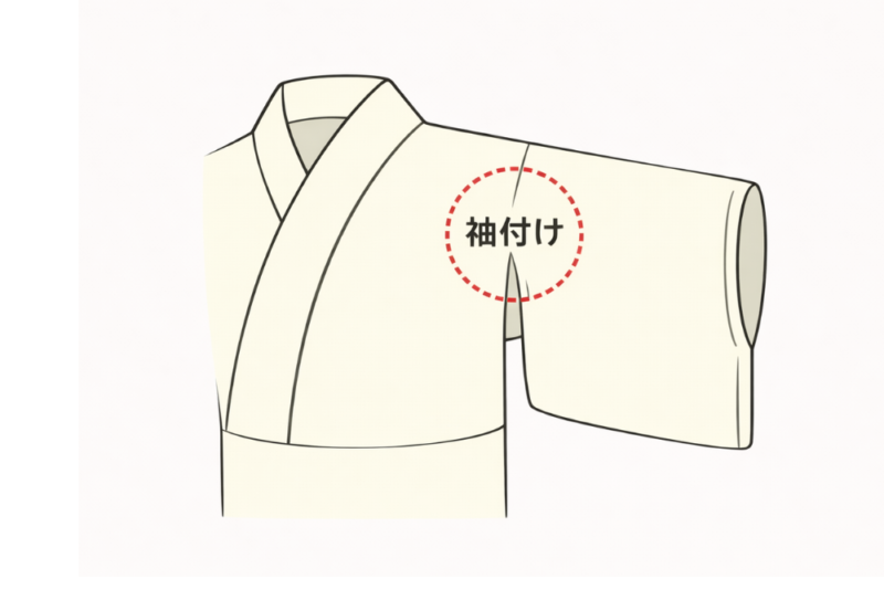 着物の「袖付け」は、袖と身頃をつなぐ縫い目の部分を指します。